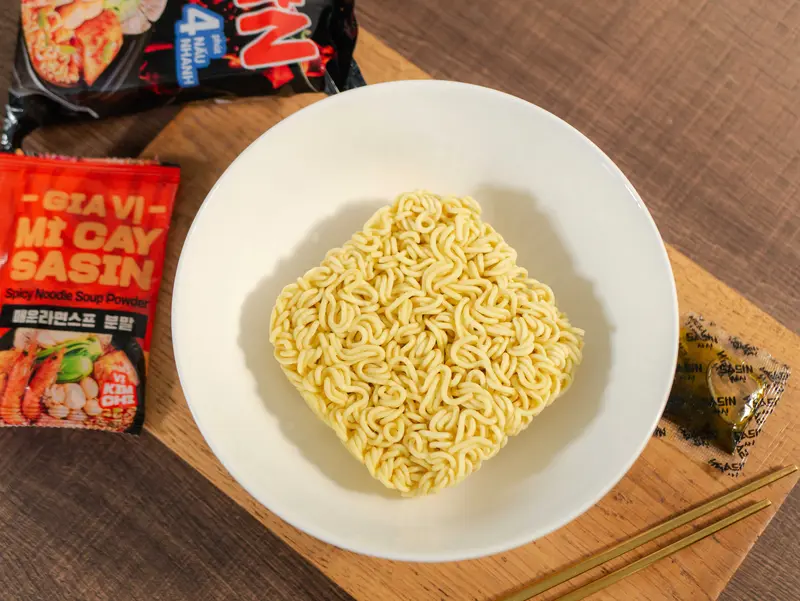 Gói mì gồm có: 1 Vắt mì Sasin, 1 gói gia vị Mì Cay Sasin Đặc Biệt – vị Kimchi, 1 gói dầu.